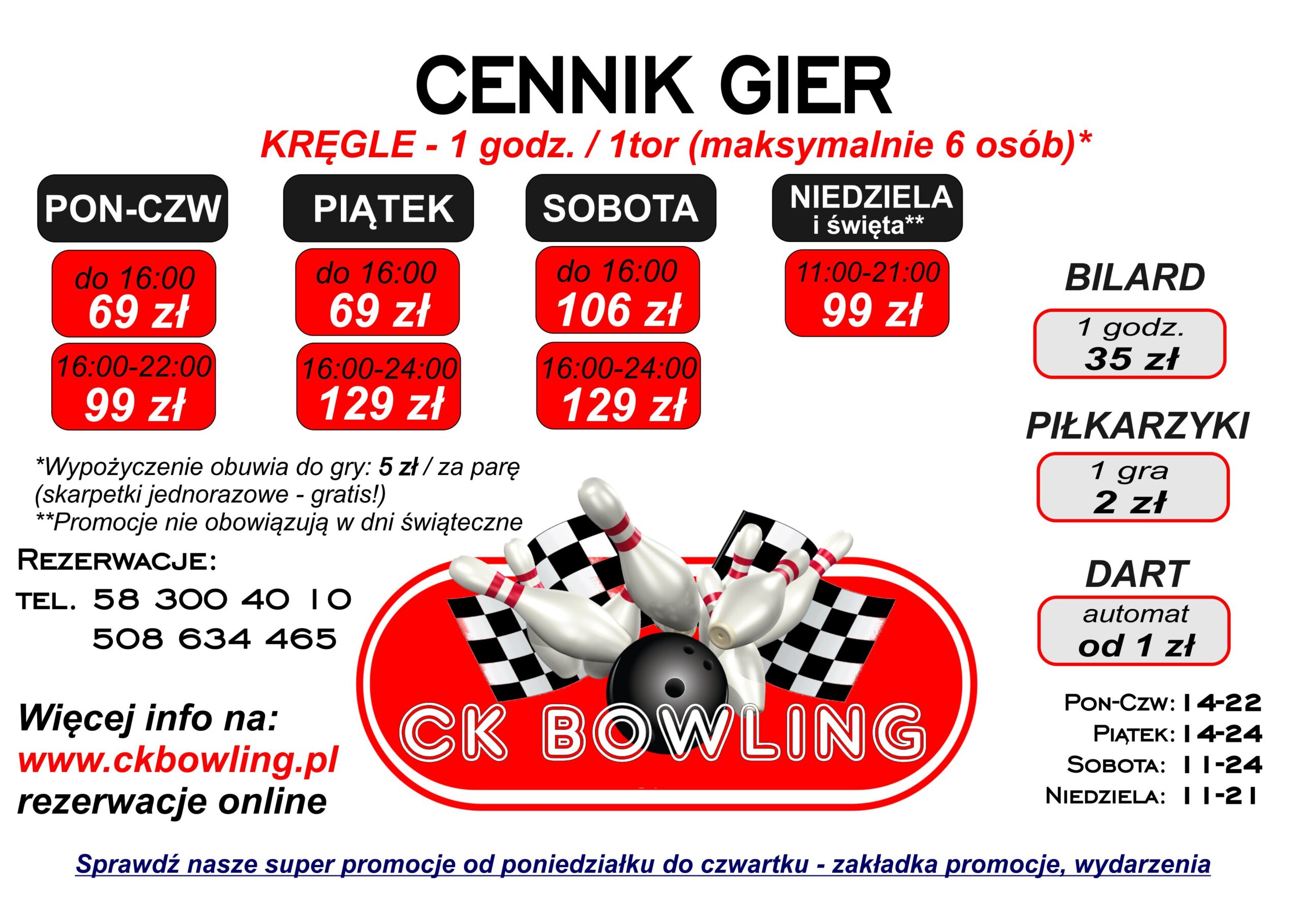Wtorek- kręgle 55zł/h, bilard 20zł/h