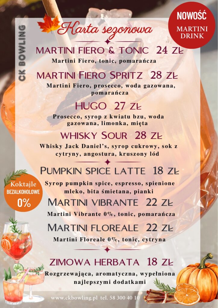 Nasze drinki: Mai Tai, Cuba Libre, Exotic Summer ,Blue Hawaii, Sex On The Beach, Mojito, Aperol Spritz, Orange Colada, Pina Colada, Long Island Iced Tea, Drink CK Bowling, kamikaze w czterech smakach.